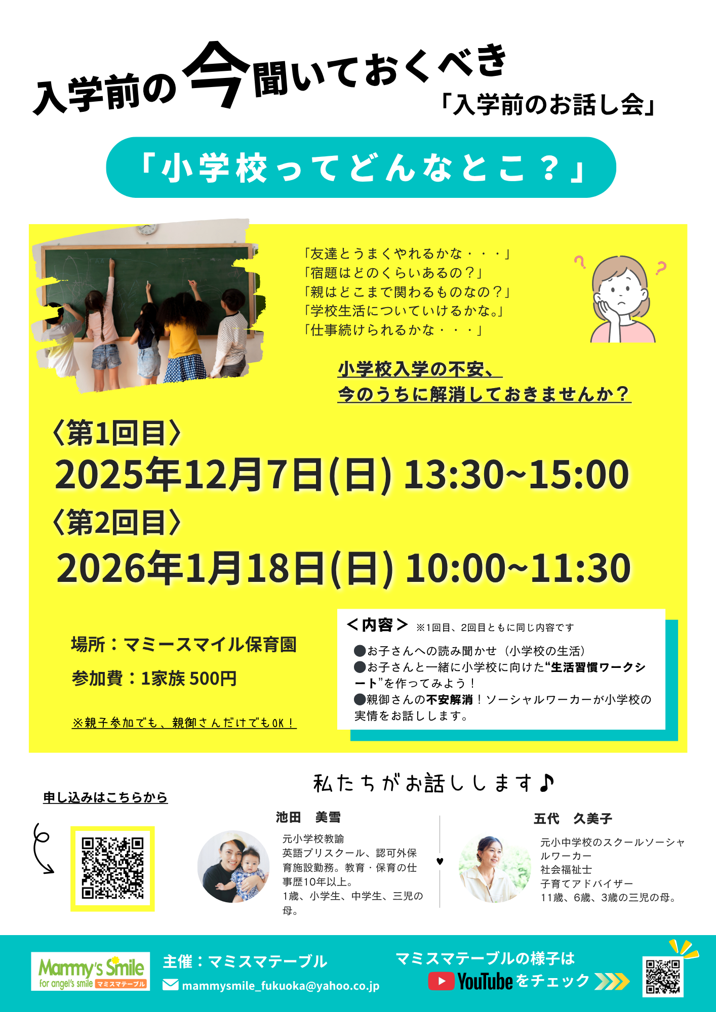 12/7(日)、1/18(日)入学前のお話し会「小学校ってどんなとこ?」